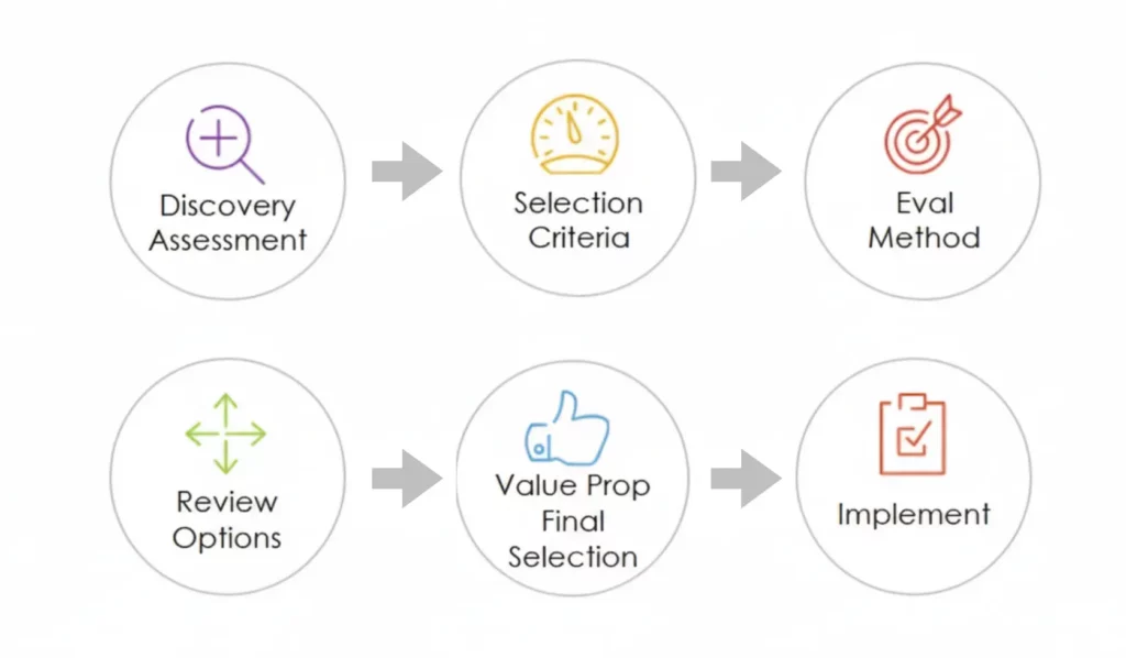 • Process: Discovery assessment → Define selection criteria → Evaluation method → Vendor review → Build value proposition → Final selection → Implement