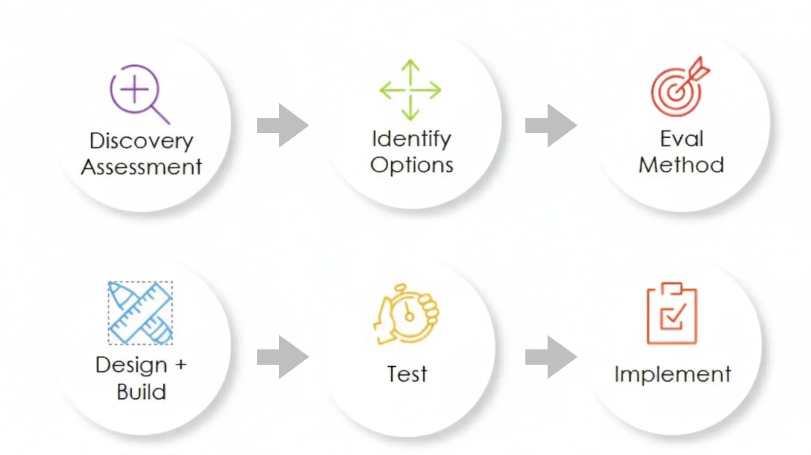 • Process: Discovery assessment → Identify options → Evaluation method → Design & build → Test → Implement